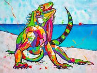 Kleurrijk schilderij van een vrolijke leguaan op het strand van de kunstenaar Renate Rolefes.