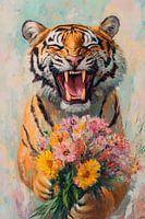 Met een stralende lach en een indrukwekkende brul presenteert het majestueuze dier een kleurrijk boeket bloemenpracht. De felle kleuren van de bloemen harmoniëren perfect met het levendige oranje van zijn vacht. Deze ongewone combinatie van wildheid en vreugde straalt een verfrissende levendigheid uit en laat de speelse kant van de…