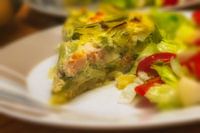 Lachs-Lauch-Quiche mit Eisberg-Tomaten-Birnensalat.