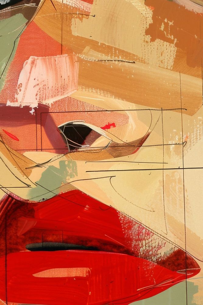 Het schilderij toont een expressief portret met krachtige kleuren en dynamische penseelstreken. De geaccentueerde rode lippen en de intens gekleurde ogen trekken onmiddellijk de aandacht. De combinatie van zachte en levendige tinten en de verschillende texturen geven het werk een fascinerende diepte en emotionaliteit.