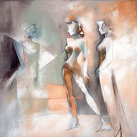 Abstracte figuratieve kunst in pastels met het portret van drie dames.