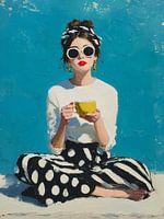 In dit werk staat eenvoud centraal. Een stijlvolle vrouw, een kop koffie en een krachtige blauwe achtergrond vormen samen een rustig maar sterk beeld.