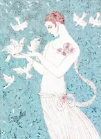 Mixed media schilderij in zachte pastel tinten. Romantisch klassiek Art deco 1920 's tafereel, vintage illustratie van een vrouw met duiven.