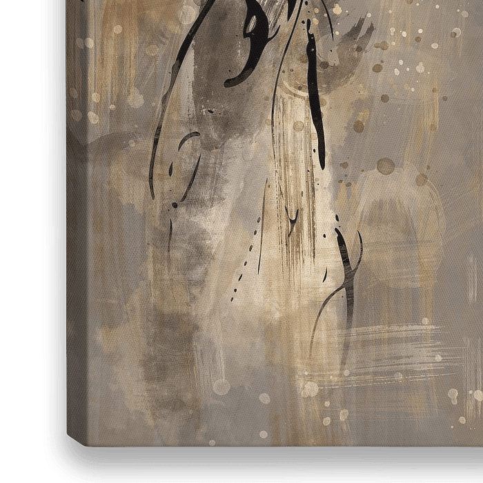 Abstract werk met warme goudbruine tinten in combinatie met taupe en greige. Je ziet een digitale versie van een handgetekend houtskool tekening. Deze dame draagt een jurk en heeft fraaie krullende haren.