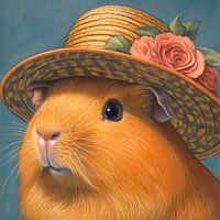 Een charmante cavia draagt een strooien hoed versierd met roze rozen, wat hem een elegante uitstraling geeft. De achtergrond is zachtblauw en benadrukt de warme tinten van de vacht van de cavia.