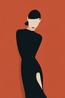 Een stijlvolle minimalistische illustratie van een elegante silhouet tegen een warme terracotta achtergrond. De figuur draagt een slanke zwarte jurk met een subtiele split en heeft een karakteristieke haarstijl. De compositie straalt verfijning en moderne eenvoud uit, met een knipoog naar vintage mode-illustraties en hedendaagse digitale kunst.