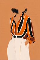 Een minimalistische illustratie van een fashionable silhouet in een oranje-zwart gestreepte blouse met hoge witte broek. De compositie straalt elegantie uit tegen een warme terracotta achtergrond, waarbij de grafische lijnen en kleurvlakken een moderne retro-sfeer creëren.