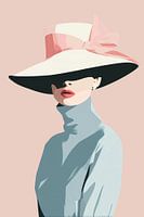 Een minimalistische illustratie in zachte pasteltinten, waarbij een elegante hoed met roze strik de blikvanger vormt. De compositie toont een verfijnde combinatie van een grijsblauwe coltrui en een statement-hoed in wit en zwart, afgemaakt met subtiele rode lippen die karakter geven aan het geheel. De kunstenaar speelt vakkundig met…