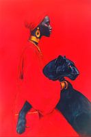 Een krachtig silhouet in vuurrood, met een sierlijke panter aan haar zijde. Samen vormen ze een onstuitbare combinatie van elegantie en oerkracht.