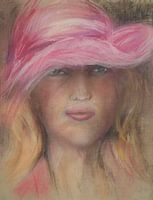 Een pasteltekening van een mooi jong meisje met een roze hoed op haar blonde haren. Onder rand van hoed kijkt ze je aan.