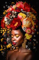 Portret van een jonge mooie vrouw met een explosie van rode en gele bloemen om haar heen
