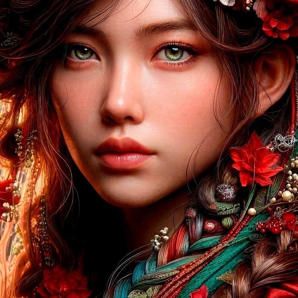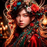 Een krachtig portret van een jonge vrouw in het rood. Ze heeft een ingewikkeld kapsel met vlechten en decoraties in rood en turquoise. Door de bokeh achtergrond wordt de focus nog meer op de jonge vrouw en haar prachtige ogen gelegd. Een ware blikvanger !