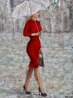 Een dame met een paraplu loopt onder de regen in een strakke en sexy jurk. In dit hedendaagse kunstwerk kunnen we genieten van een mooie contrast tussen de grijze omgeving en de lady in red. De structuur en de kleuren van het achtergrond versterken het werk.