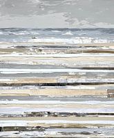 abstracte interpretatie van een landschap, opgebouwd uit horizontale lagen in zachte aardse tinten zoals beige, wit, grijs en taupe. De gelaagdheid doet denken aan een uitgestrekt kustlandschap of een verre horizon, waar lucht en land in elkaar overvloeien. De texturen in de lagen variëren: sommige zijn glad en subtiel, terwijl andere meer dynamisch en verweerd zijn, met dikke verfstreken die een tastbare dimensie toevoegen.