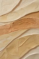 abstracte compositie van gelaagde texturen en zachte aardetinten. De overlappende vormen en lijnen lijken te verwijzen naar natuurlijke elementen zoals zandduinen, gesteente of aardlagen. De kleuren variëren van crème en beige tot warme terracotta tinten, wat een harmonieuze en rustgevende uitstraling geeft. De zichtbare texturen in de lagen voegen een tactiele dimensie toe, waardoor het werk bijna tastbaar aanvoelt.