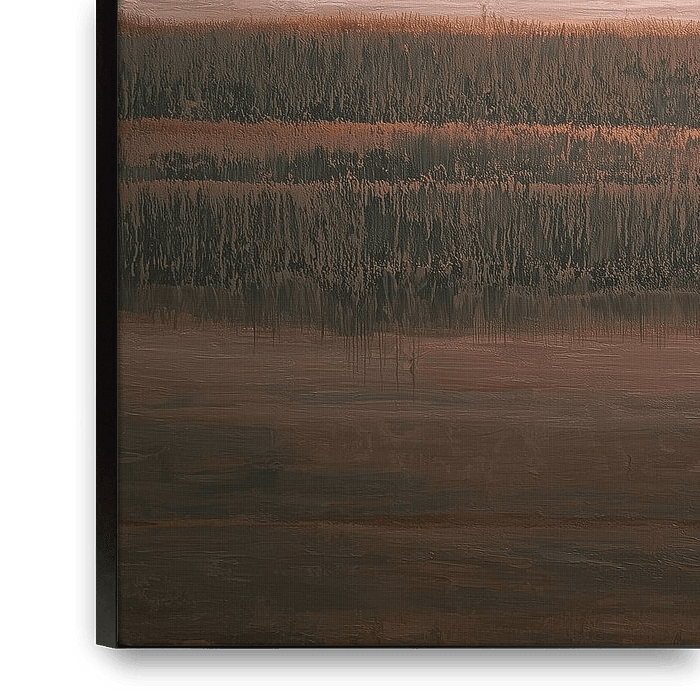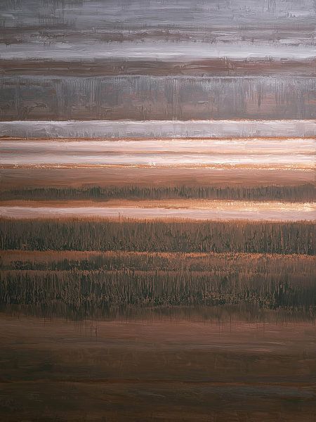 schilderij bestaat uit horizontale lagen die als atmosferische stroken over het canvas zijn verdeeld. Het werk maakt gebruik van een warm aardetintenpalet: koperbruin, roest, goudachtig beige en koelere grijsblauwe nuances vloeien subtiel in elkaar over. De verfstructuur is duidelijk zichtbaar en lijkt met paletmes of brede kwaststreken…