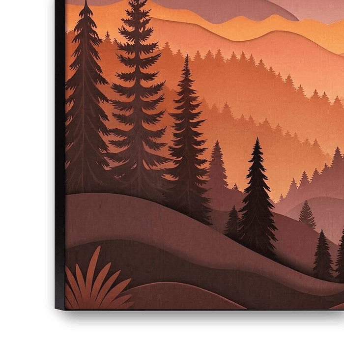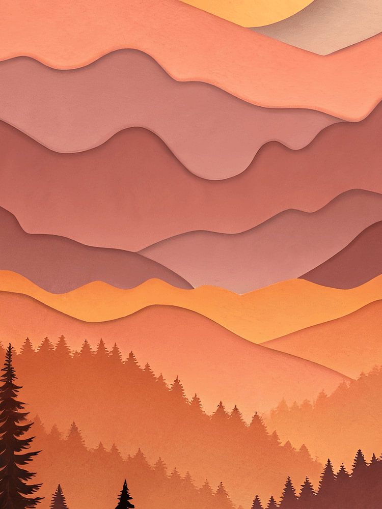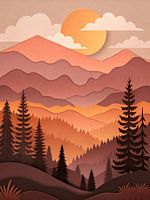 Deze afbeelding heeft een gestileerd, gelaagd landschap met een duidelijk handgemaakte of papierknip-esthetiek. Het roept een warme, serene zonsondergang op in een bergachtig gebied, afgebeeld met een beperkt kleurenpalet van warme bruintinten, sinaasappels en zachte crèmes.