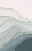 Minimalistische en meditatieve compositie opgebouwd uit zachte, gelaagde vormen die in transparante lijnen over elkaar heen vloeien. De kleuren variëren subtiel van wit en lichtgrijs tot donkergroen-blauw, waardoor een natuurlijke overgang ontstaat die doet denken aan mistige bergen, duinen of golvende watermassa’s.