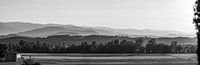 Een landschapsfoto waarin door de aanweigheid van mistflarden in de bergen diverse lagen in de diepte zijn ontstaan.