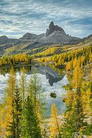 De zon verlicht de gele lariksen aan het Lago Federa in de Ampezzo Dolomieten.
