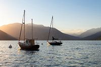 Lago Maggoire, Italië bij zonsondergang. Bootjes dobberen op het meer met in de achtergrond de Alpen. De bergen worden nog net beschenen door de stralen van de ondergaande zon. Een mooie avond gefotografeerd vanaf de kade van het stadje Verbania.