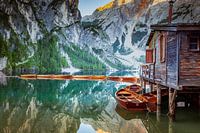 Een prachtig helder meer in de Dolemieten. Een boothuis met roeibootjes die te huur zijn voor de vele toeristen die dit meer aantrekt. Het water is kraakhelder koel bergwater. Pragser Wildsee wordt ook vaak Lago di Braies genoemd. Dit is het grootste natuurlijke meer van de Dolomieten. Zoals alles in de Dolomieten worden hier twee talen gesproken. De Italiaanse naam is Lago di Braies, in het Duits is het Pragser Wildsee. Beide namen worden veel gebruikt voor dit wonderlijke meer in de Dolomieten in Italië.