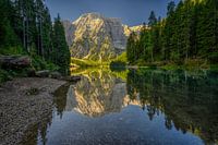 Prachtige spiegeling in het Lago di Braies, ook wel bekend onder de Duitse naam Pragser Wildsee. In het noorden van de Dolomieten wordt nog veel Duits gesproken, omdat het vroeger onder Oostenrijk viel.