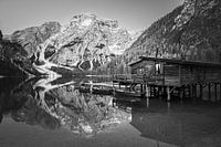 Een zwart-wit foto van een vroege lente ochtend voor zonsopkomst bij het boothuis en de beroemde bootjes bij de Pragser Wildsee (Lago di Braies), een pittoresk meer in de Dolomieten in Zuid-Tirol, Italië. Gedurende de dag is het hier een drukte van belang, maar voor zonsopkomst ervaar je de rust en stilte van dit overweldigend landschap.