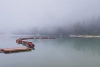 Ochtendmist boven Lago di Braies in de Dolomieten. De Dolomieten liggen in het noorden van Italië, dit is het Zuid-Tirol gedeelte. Het meer gefotografeerd in de vroege ochtend toen er mist boven het meer hing. De bootjes liggen nog voor half 9 vast aan elkaar en vormen zo een lint in het meer.