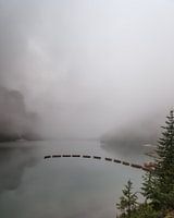 Ochtendmist boven Lago di Braies in de Dolomieten. De Dolomieten liggen in het noorden van Italië, dit is het Zuid-Tirol gedeelte. Het meer gefotografeerd in de vroege ochtend toen er mist boven het meer hing. De bootjes liggen nog voor half 9 vast aan elkaar en vormen zo een lint in het meer.