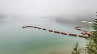 Ochtendmist boven Lago di Braies in de Dolomieten. De Dolomieten liggen in het noorden van Italië, dit is het Zuid-Tirol gedeelte. Het meer gefotografeerd in de vroege ochtend toen er mist boven het meer hing. De bootjes liggen nog voor half 9 vast aan elkaar en vormen zo een lint in het meer.