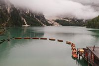Ochtendmist boven Lago di Braies in de Dolomieten. De Dolomieten liggen in het noorden van Italië, dit is het Zuid-Tirol gedeelte. Het meer gefotografeerd in de vroege ochtend toen er mist boven het meer hing. De bootjes liggen nog voor half 9 vast aan elkaar en vormen zo een lint in het meer.