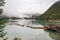 Ochtendmist boven Lago di Braies in de Dolomieten. De Dolomieten liggen in het noorden van Italië, dit is het Zuid-Tirol gedeelte. Het meer gefotografeerd in de vroege ochtend toen er mist boven het meer hing. De bootjes liggen nog voor half 9 vast aan elkaar en vormen zo een lint in het meer.