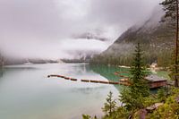 Ochtendmist boven Lago di Braies in de Dolomieten. De Dolomieten liggen in het noorden van Italië, dit is het Zuid-Tirol gedeelte. Het meer gefotografeerd in de vroege ochtend toen er mist boven het meer hing. De bootjes liggen nog voor half 9 vast aan elkaar en vormen zo een lint in het meer.