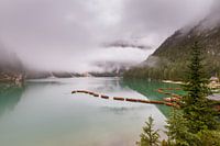 Ochtendmist boven Lago di Braies in de Dolomieten. De Dolomieten liggen in het noorden van Italië, dit is het Zuid-Tirol gedeelte. Het meer gefotografeerd in de vroege ochtend toen er mist boven het meer hing. De bootjes liggen nog voor half 9 vast aan elkaar en vormen zo een lint in het meer.