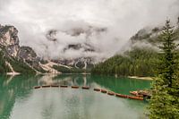 Ochtendmist boven Lago di Braies in de Dolomieten. De Dolomieten liggen in het noorden van Italië, dit is het Zuid-Tirol gedeelte. Het meer gefotografeerd in de vroege ochtend toen er mist boven het meer hing. De bootjes liggen nog voor half 9 vast aan elkaar en vormen zo een lint in het meer.