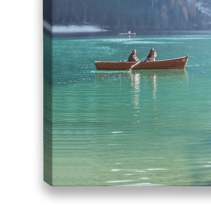 Vroege herfst bij het meer van Braies in de Italiaanse Dolomieten. Een rustieke houten hut staat boven smaragdgroen water, terwijl een kleine roeiboot rustig in de verte drijft. Omringd door majestueuze bergtoppen en zacht gouden licht, legt deze fine art foto een sereen moment van stilte en verbondenheid met de natuur vast. Ideale…