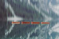 Foto genomen in de vroege ochtend van de typische bootjes op de Lago di Braies (Dolomieten), overdag worden deze bootjes verhuurd aan de toeristen om te genieten van de schitterende omgevin.