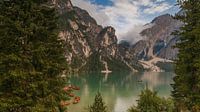 Lago di Braies het bergmeer in de Dolomieten. Het is omringd door de bergen en de kleur van het erg koude water is prachtig turquoise.
