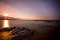 Het Garda meer gefotografeerd met een 10 stops filter. Door de lange sluitertijd wordt het water een mooi glad geheel. De zon piept in de vroegte mooi over de toppen van de bergen