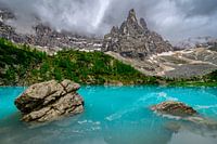 Lago di Sorapis (meer van Sorapis) in de Dolomieten tijdens een bewolkte lentedag met een sterke turquoise kleur afkomstig van stof van de gletsjer.