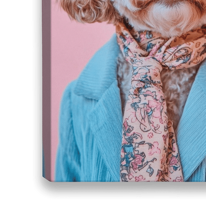 Met zijn charmante glimlach en coole zonnebril straalt deze Lagotto Romagnolo ongelooflijke elegantie uit. Zijn krullende, harige uiterlijk wordt perfect aangevuld door een stijlvol pak en een modieuze halsdoek. Dit kleine mode-icoon belichaamt levensvreugde en verfijning in een vrolijke, pastelkleurige setting. Een echte meester in…