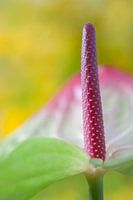 Close-up van de kamerplant Anthurium andraeanum, met een sfeervolle, gele achtergrond.