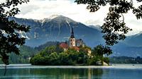 eilandje in het meer van Bled, Slovenië met besneeuwde bergen op de achtergrond en takken met bladeren rondom de foto