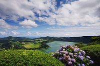 Kratermeer met Hortensia bij Furnas op het eiland Sao Miguel op de Azoren