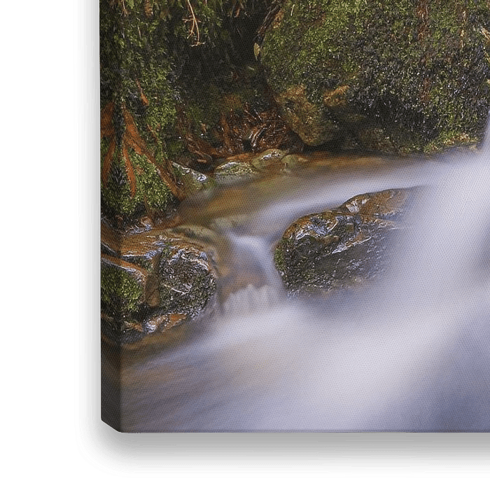 Een horizontale 16:9 foto van een smalle rivier met een stroomversnelling waar een kleine waterval doorheen stroomt.