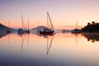 Lake District, Engeland bij zonsopgang. Een prachtig landschap met enkele zeilboten die reflecteren in het meer Ullswater. Ullswater is het op één na grootste meer in het Lake District, Cumbria en geliefd in de landschapsfotografie.