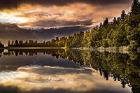 Zonsopkomst bij Lake Matheson op het Zuidereiland van Nieuw Zeeland bij Fox Glacier met uitzicht op Mount Cook en Mount Tasman.