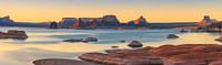 View over the Padre Bay at sunrise as seen from Cookie Jar Butte on Lake Powell, on the border between Utah and Arizona, United States.