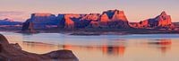View over the Padre Bay at sunrise as seen from Cookie Jar Butte on Lake Powell, on the border between Utah and Arizona, United States.